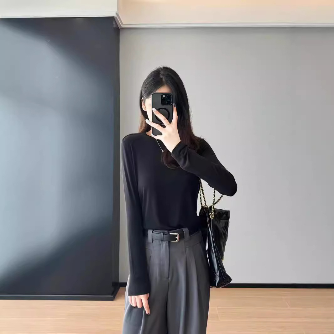 SS174 High Stretch Solid Colour Basic Simple Positive Shoulder Long Sleeve Bottom Shirt T-Shirt